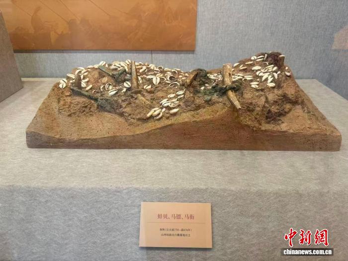 2月10日,“黃土尋駿——山西出土馬文物展”在山西考古博物館開展。圖為出土于山西垣曲北白鵝墓地的一組馬鏢、馬銜、蚌貝。 中新社記者 楊靜 攝 策展人馬煜娟介紹,“邊發(fā)掘、邊展示”是本次展覽的一大亮點。其中,出土于山西垣曲北白鵝墓地的一組馬鏢、馬銜與蚌貝飾件是首次面向公眾展出?!鞍鲐悶轳R頭上的裝飾,這組出土不久的文物,能讓觀眾感受到文物出土?xí)r的原始狀態(tài),拉近公眾與考古現(xiàn)場的距離?!?/p> 隋唐時期,馬具、馬飾的發(fā)展達到高峰。隨著馬具的完善,馬成為日常生活中的代步工具,為不善騎行的貴族子弟和婦女騎乘使用。展廳中兩件出土于山西臨汾西趙遺址的唐女性騎馬陶俑,正是這一時期女性社會活動與出行風貌的寫照。