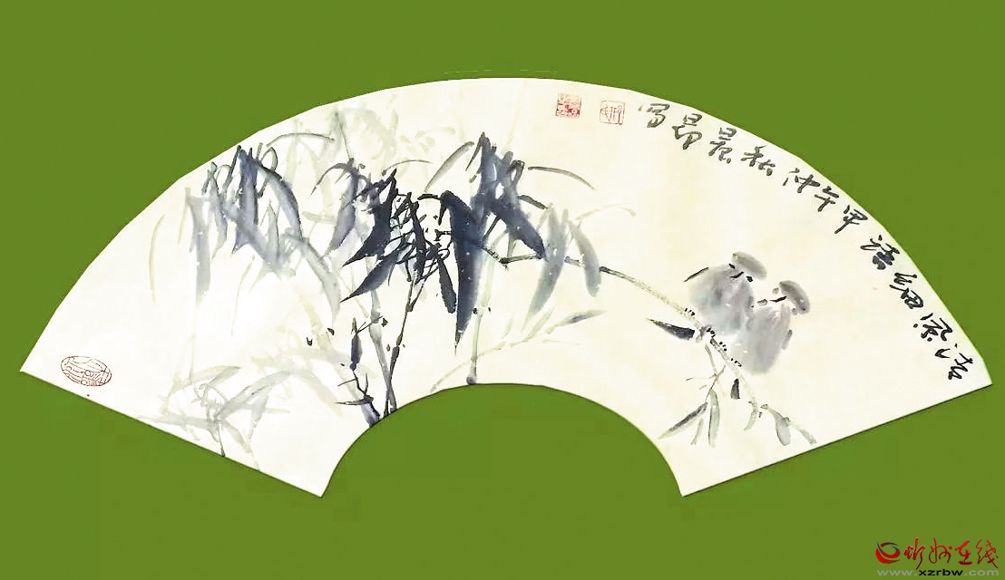 邢晨昂畫竹,已非一日之功。起先畫竹只因其簡單,兩枝三葉,成畫容易。從不得要領到漸入佳境,如今,伏案落筆便是一簇靈動之竹,大多清寫淡描,蛋黃點點,柔葉婆娑,疑似颯颯作響,頗見禪意幽幽。也有一些枝葉簡約,寥寥數(shù)筆,不枝不蔓,風骨畢現(xiàn)。