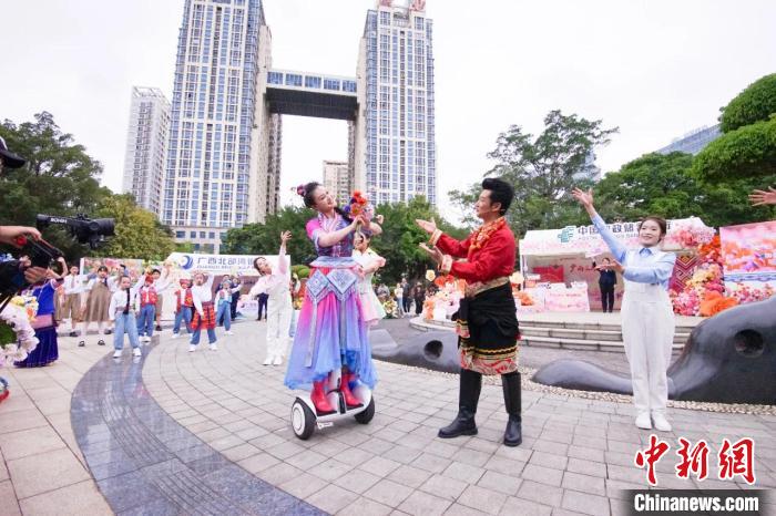 圖為彩調(diào)劇《新劉三姐》。廣西戲劇院 供圖 廣西戲劇院以山歌回蕩城市文創(chuàng)街區(qū),傳統(tǒng)藝術點亮城市時尚。活動期間,南寧市百益上河城工業(yè)文化創(chuàng)意園,彩調(diào)劇《劉三姐·盤歌》選段亮相2025年“廣西三月三·八桂嘉年華”南寧市“綠城歌臺”群眾文化活動,詼諧幽默的盤歌對唱,吸引年輕觀眾互動,形成傳統(tǒng)與現(xiàn)代交融的獨特觀感。 此外,在“廣西三月三·八桂嘉年華”開幕式暨“四季村歌”活動啟動儀式上,廣西戲劇院“新劉三姐”扮演者陳慧身著絢麗民族盛裝,攜手多地游客共唱山歌,融合平衡車表演和戲曲唱腔的演繹方式,展現(xiàn)廣西山歌與時俱進演變過程,為廣西“三月三”這場民族盛會添新潮。