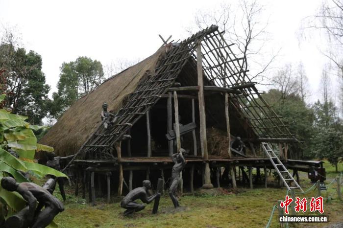 河姆渡遺址干欄式建筑復原圖(資料圖)。 (寧波市文化遺產管理研究院供圖)