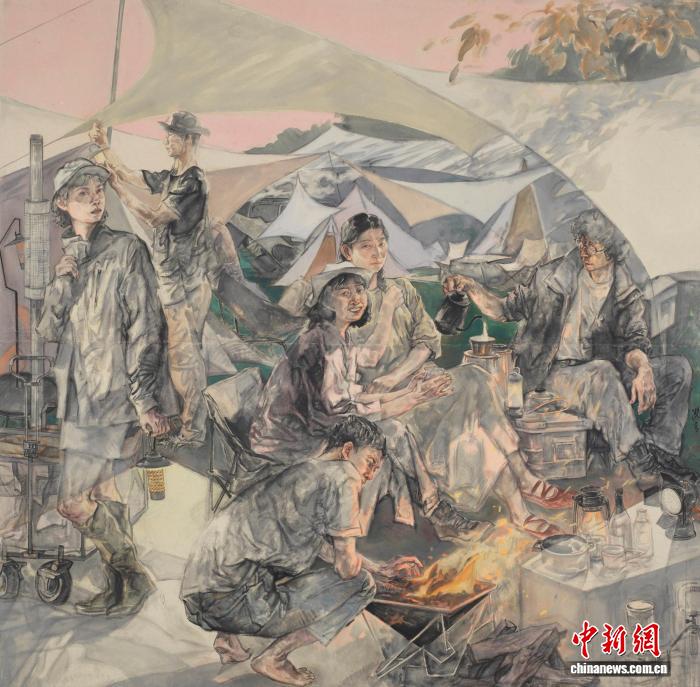 以畫家藺潔青的中國畫《清風(fēng)徐來》為例,其是浙江省第十五屆美術(shù)作品展金獎作品,以傳統(tǒng)人物畫技法表現(xiàn)當代青年郊野露營場景,通過描繪清風(fēng)拂過林間被永恒定格的瞬間,傳遞都市人向往自然、追求心靈自由的當代精神,展現(xiàn)出中國傳統(tǒng)繪畫語言在表現(xiàn)現(xiàn)實題材上的蓬勃生命力。