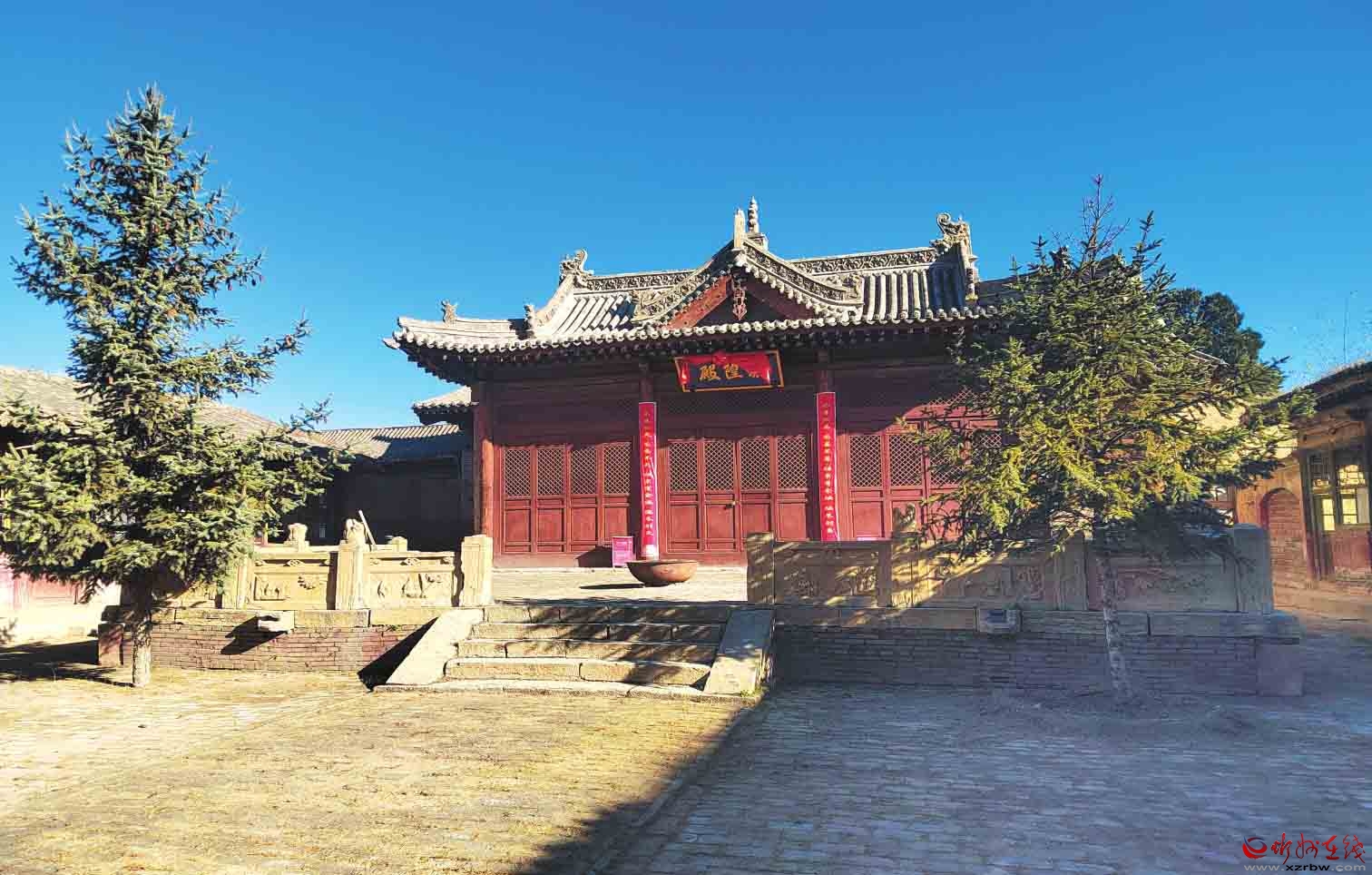 一進(jìn)院布局,中軸線(xiàn)現(xiàn)存有正殿1棟,兩側(cè)建有配殿,西北角建有偏殿。正殿磚砌臺(tái)基,面寬五間,進(jìn)深六椽,七檁前后廊式構(gòu)架,前檐斗拱為五踩,后檐為三踩斗拱,單檐懸山頂。前設(shè)月臺(tái),建有抱廈三間,單檐歇山頂?,F(xiàn)新塑像3尊,正殿梁架有彩繪。