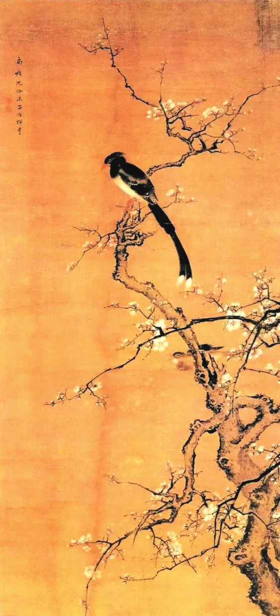 宋代畫家筆下的梅花大都與禽鳥有所關(guān)聯(lián),這主要得益于花鳥畫在此時(shí)的繁盛之勢。宋徽宗趙佶的《臘梅山禽圖》就把梅花與白頭翁聯(lián)系起來,描繪了在乍暖還寒的季節(jié)里,兩只相伴而生的白頭翁立于臘梅枝頭的場景,給觀者帶來復(fù)蘇之感。作品左下角題詩“山禽矜逸態(tài),梅粉弄輕柔。已有丹青約,千秋指白頭”,表達(dá)了愛情之思。因?yàn)榘最^翁在傳統(tǒng)文化中象征吉祥與幸福,是對白頭偕老的隱喻,當(dāng)它與梅花結(jié)合起來時(shí),便會強(qiáng)化人們對美好愛情的聯(lián)想。