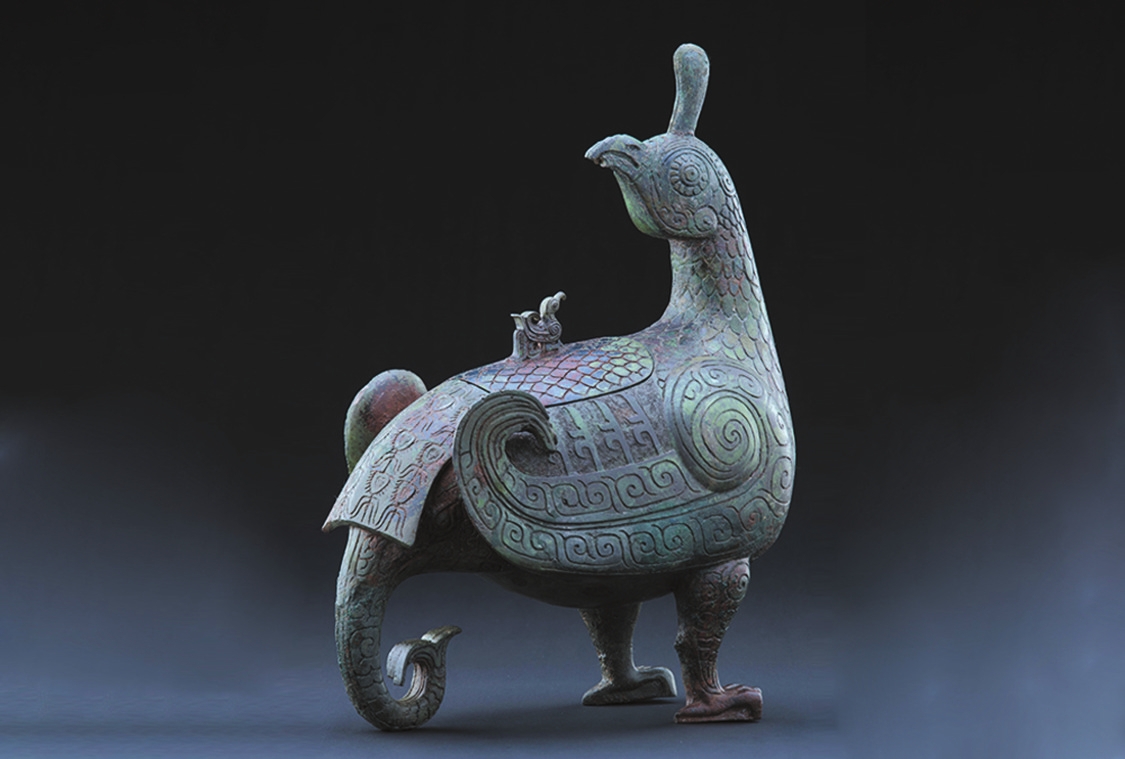 山西,東倚巍峨太行,西臨滔滔黃河,表里山河。作為中華民族的重要發(fā)祥地之一,這里地上地下的古代遺珍燦若星辰。晉侯鳥尊,高39厘米,長30.5厘米,寬17.5厘米。整個(gè)器物以佇立回首的鳳鳥為主體造型,鳥頭微昂,圓睛凝視,高冠直立,體軀豐滿,兩翼上卷。鳥背依形設(shè)蓋,蓋鈕為小鳥形,與鳳鳥對(duì)望,雙腿粗壯,爪尖略蜷。全身布滿了精美紋飾,頸、腹、背裝飾羽片紋,兩翼與雙腿裝飾云紋,翼、蓋間裝飾立羽紋,以雷紋襯底,尾部裝飾華麗的羽翎紋。
