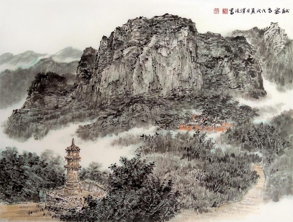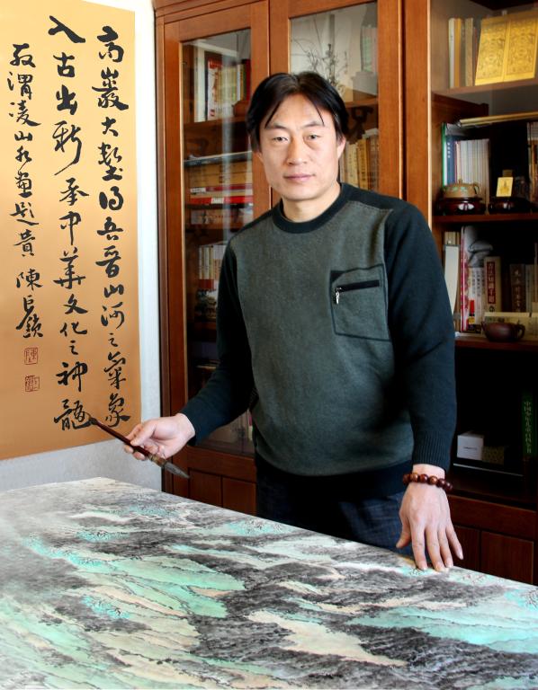 認(rèn)識(shí)殷渭凌,是先認(rèn)識(shí)他的畫,前幾年在一次省里畫展上看到了一幅山水畫,淳樸、厚重,樸實(shí)的親切、厚重的實(shí)在,完全沒有近幾年流行的風(fēng)氣,也沒有長(zhǎng)期臨摹傳統(tǒng)繪畫形成的習(xí)氣。正如一個(gè)從鄉(xiāng)村走出來(lái)的小伙,健康、有朝氣、單純、樸實(shí)、憨厚、怯生生的站在那里,給我留下了很深的印象。因?yàn)樾弥莸貐^(qū)畫山水的人不多,很快就認(rèn)識(shí)了渭凌。果然人如其畫,淳樸、厚道、話不多、為人真誠(chéng),是個(gè)畫畫肯下功夫的小伙子。后來(lái)省美協(xié)山水畫藝委會(huì)的活動(dòng)都有他的身影,畫越畫越多,畫的也越來(lái)越好,但是畫面中那種親切、樸實(shí)、厚重、蒼茫的特點(diǎn)卻一點(diǎn)兒也沒有丟失。濃濃的泥土氣息生發(fā)于筆墨中,散發(fā)在畫面里,在展廳里感染著每一個(gè)觀眾。晉西北風(fēng)情在他的營(yíng)造下得到了充分的體現(xiàn)。
