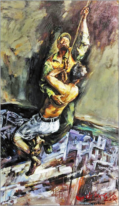 作品《空中救援》中,觀者首先感受到的就是難度。主題表現(xiàn)的事件難度和畫面表現(xiàn)處理的難度交織在一起,讓我們在驚險(xiǎn)、焦急的心理壓力下感受到生命的脆弱??罩芯仍闪松奈ㄒ煌ǖ馈>仍瑯邮请U(xiǎn)象環(huán)生、驚心動(dòng)魄。從畫面處理技巧上是一種挑戰(zhàn),天空與地面的透視關(guān)系,動(dòng)感與靜態(tài)的對(duì)立統(tǒng)一,那種命懸一線的緊迫感對(duì)心理的沖擊力,通過大刀闊斧的刮刀、筆觸處理,和蒼涼緊迫的色調(diào)關(guān)系,準(zhǔn)確地展示了主題思想,大膽省略了一些不必要的細(xì)節(jié)描寫。用大筆觸、大色塊表現(xiàn)背景的壓抑和險(xiǎn)峻,救援主體成為沖破這一重壓的希望之色。沒有去刻意刻畫天與地的真實(shí)場景,簡潔概括但不呆板空洞,這種果斷的駕馭,是續(xù)鶴賢真實(shí)實(shí)力的體現(xiàn)。 邢晨聲 文