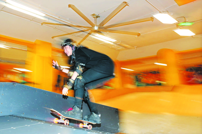 林子祎在北京的一家滑板俱樂部內(nèi)練習滑板(8月4日攝)。新華社記者 李明 攝