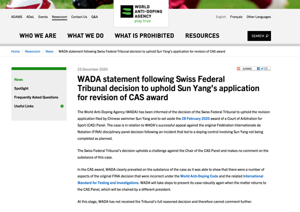 在得知瑞士最高法院撤銷對孫楊的裁決后,WADA對此事發(fā)表聲明稱,已得知瑞士聯(lián)邦最高法院支持孫楊對CAS判決的改判請求,會積極采取行動,在案件回到國際體育仲裁法庭后,繼續(xù)陳述其立場。聲明如下: