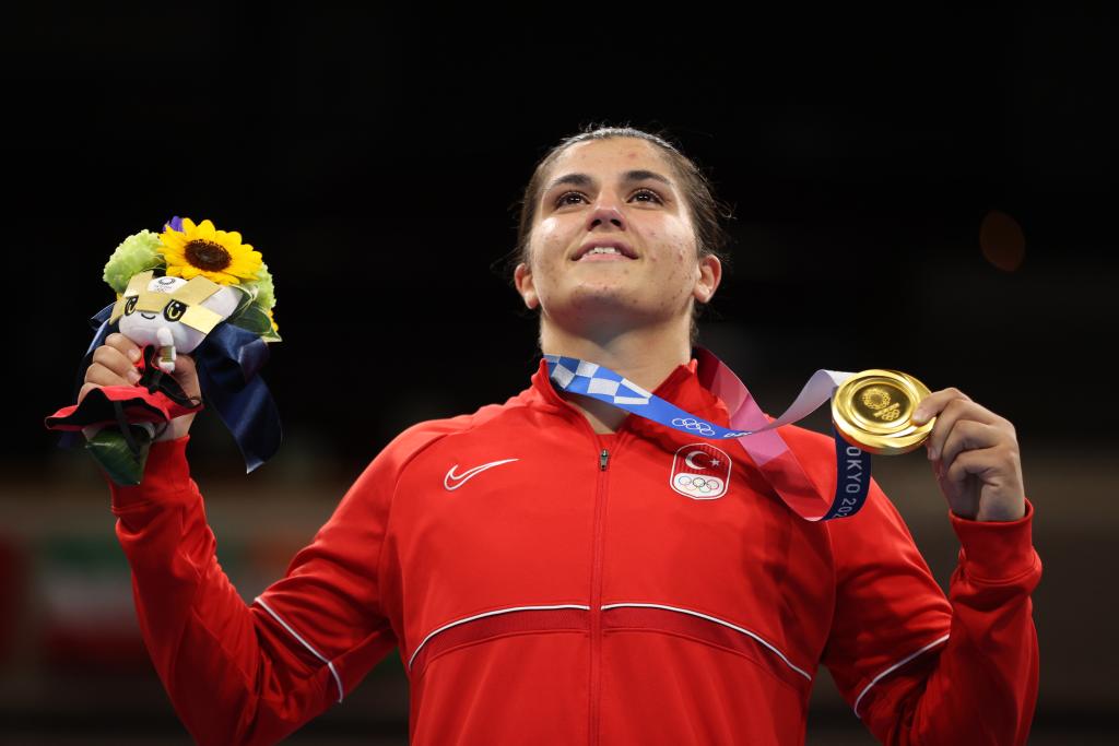 2021年8月7日,獲得冠軍的土耳其選手蘇梅內(nèi)利在領獎臺上。當日,東京奧運會拳擊女子69公斤級頒獎儀式舉行。新華社記者 歐東衢 攝
