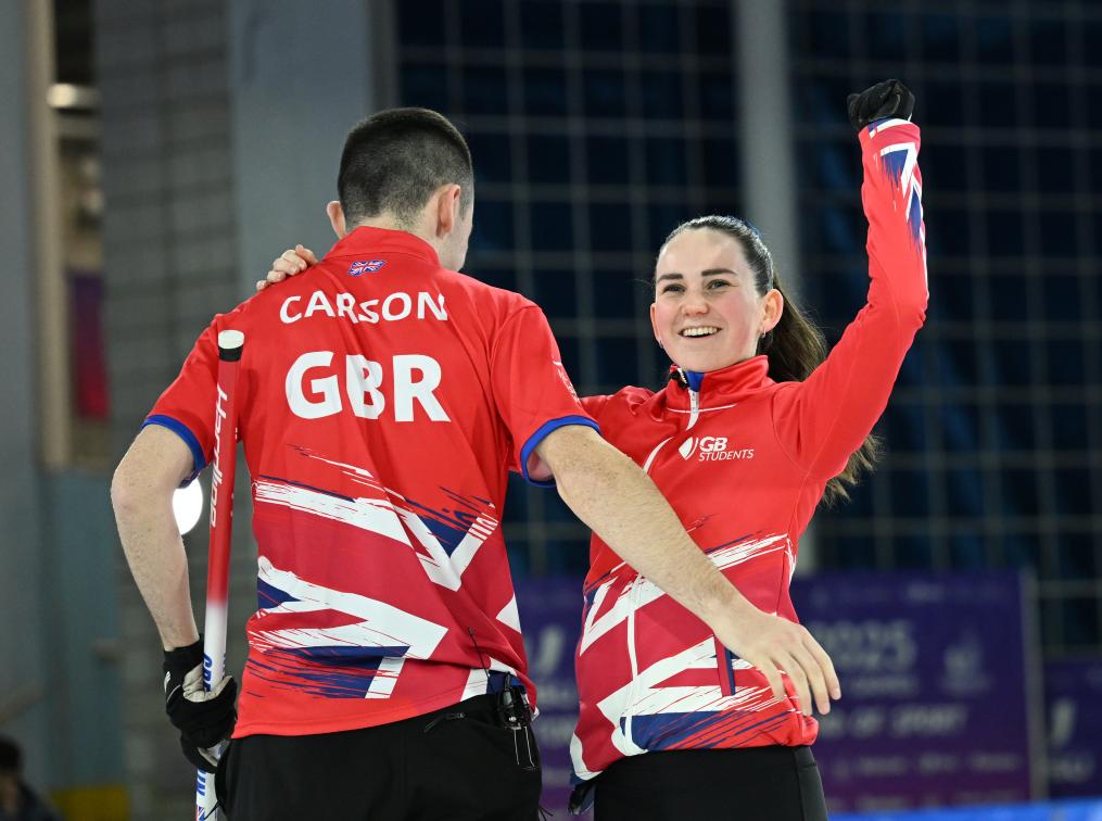 冰壺混雙項(xiàng)目是本屆大冬會首次設(shè)立的比賽項(xiàng)目,吸引了來自8個代表團(tuán)的隊(duì)伍參賽。決賽在英國隊(duì)和德國隊(duì)之間展開。英國組合芒羅和卡森表現(xiàn)出色,以10:8戰(zhàn)勝德國隊(duì),奪得歷史首金。