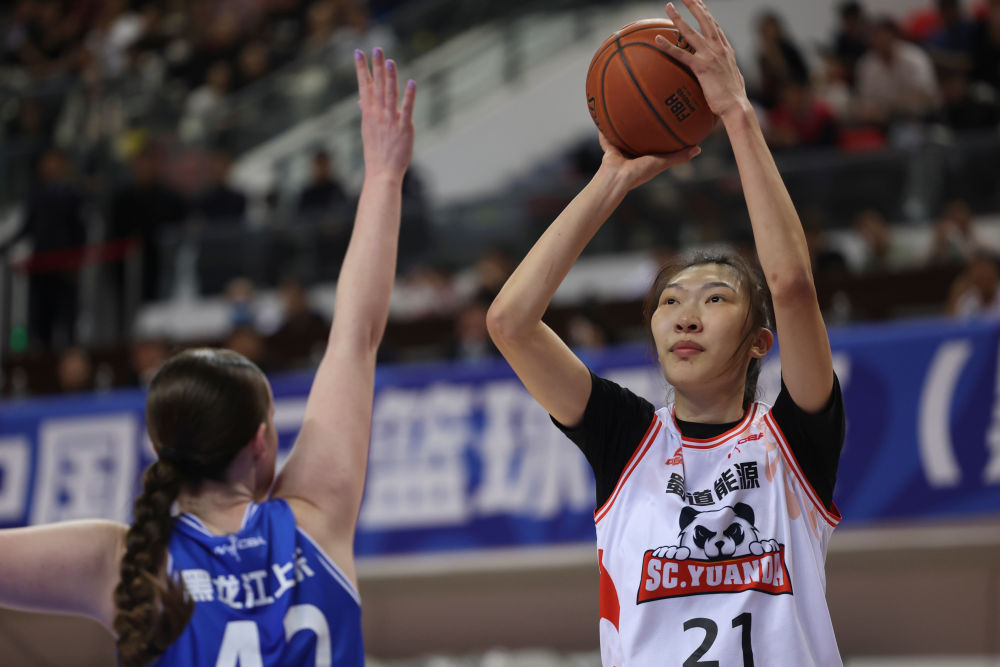 2月28日,四川隊球員韓旭(右)在2024-2025賽季中國女子籃球聯(lián)賽(WCBA)季后賽第一輪比賽中投籃。新華社記者 張濤 攝