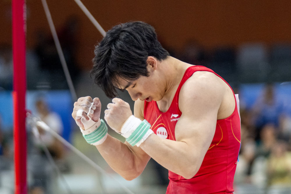 男子單杠決賽是當(dāng)晚焦點(diǎn),此前比賽日未能摘金的張博恒出戰(zhàn)。他做出多個(gè)高難度動(dòng)作,平穩(wěn)落地之后緊握雙拳慶祝,以14.860分奪冠。江蘇隊(duì)何翔、北京隊(duì)肖若騰分獲銀牌、銅牌。