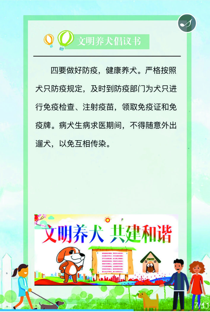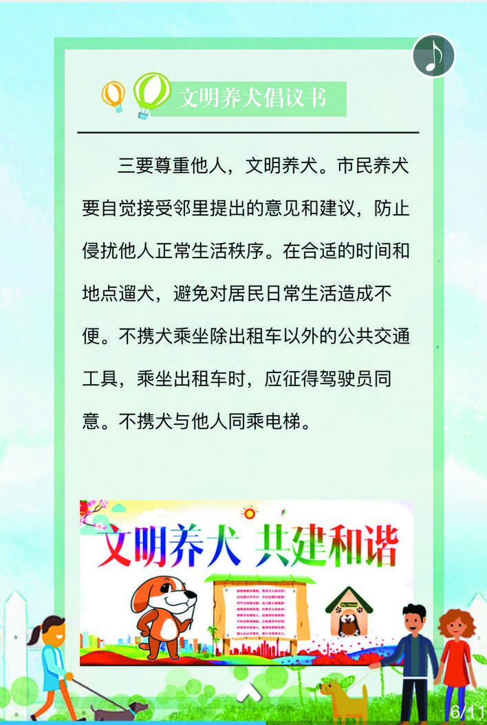 《文明養(yǎng)犬公告》包含十一項主要內(nèi)容,具體是:一、養(yǎng)犬人應(yīng)當(dāng)遵守有關(guān)法律、法規(guī),尊重社會公德,維護公共秩序,不得損害社會公共利益和他人的合法權(quán)益;二、養(yǎng)犬管理按照重點管理區(qū)和一般管理區(qū)實行分區(qū)管理。忻府轄區(qū)外環(huán)線范圍以內(nèi)為養(yǎng)犬重點管理區(qū)。其他區(qū)域為養(yǎng)犬一般管理區(qū);三、養(yǎng)犬實行狂犬病免疫制度。犬只出生滿三個月或者免疫期滿的,養(yǎng)犬人應(yīng)當(dāng)攜犬只到獸醫(yī)主管部門公布的犬只免疫網(wǎng)點接種狂犬疫苗;四、在重點管理區(qū)內(nèi)養(yǎng)犬實行責(zé)任書制度。村(居)民委員會或者社區(qū)物業(yè)管理機構(gòu)應(yīng)當(dāng)與養(yǎng)犬人簽訂養(yǎng)犬責(zé)任書,明確有關(guān)文明養(yǎng)犬的責(zé)任事項;五、在重點管理區(qū)內(nèi)養(yǎng)犬實行登記制度。養(yǎng)犬人應(yīng)當(dāng)自取得免疫證明之日起三十日內(nèi),到居住地公安派出所辦理養(yǎng)犬登記;六、在重點管理區(qū)內(nèi),禁止飼養(yǎng)、繁殖和經(jīng)營禁養(yǎng)名錄內(nèi)的烈性犬和大型犬(導(dǎo)盲犬除外);禁止開辦犬類養(yǎng)殖場;七、在重點管理區(qū)內(nèi)攜帶犬只出戶,應(yīng)當(dāng)遵守下列規(guī)定:(一)為犬只佩帶犬牌、束牽引帶,牽引帶長度不得超過兩米,在擁擠場合自覺收短牽引帶。(二)具有完全民事行為能力的人牽引。(三)主動避讓老年人、殘疾人、孕婦和兒童。(四)乘坐電梯,應(yīng)當(dāng)避開高峰期,征得電梯內(nèi)其他人的同意,佩戴嘴套或裝入犬籠、犬袋,并主動避讓他人。(五)及時清除犬只排泄的糞便。(六)不得攜犬進入設(shè)有犬類禁入標志的公園、廣場等公共場所。(七)不得攜犬乘坐大型公共交通工具,攜犬乘坐出租汽車時,須征得司機同意。(八)養(yǎng)犬不得干擾他人正常生活,不得放任、驅(qū)使犬只恐嚇、攻擊他人,影響他人休息的,養(yǎng)犬人應(yīng)當(dāng)采取措施予以制止;八、凡流浪犬或無人牽領(lǐng)的犬只,視為無主犬只予以收容;九、市民養(yǎng)犬應(yīng)當(dāng)按規(guī)定對所養(yǎng)犬只注射狂犬疫苗、定期檢疫。犬只出現(xiàn)狂犬癥狀的,養(yǎng)犬人應(yīng)當(dāng)及時采取捕滅措施,并向農(nóng)業(yè)部門報告,危害公共安全的,應(yīng)及時報告公安部門;十、違反有關(guān)規(guī)定將依據(jù)《忻州市養(yǎng)犬管理條例》、《中華人民共和國治安管理處罰法》等法律進行處罰;十一、廣大市民應(yīng)積極抵制不文明養(yǎng)犬行為。對違反本通告規(guī)定的養(yǎng)犬行為,任何單位和個人都有權(quán)批評、勸阻,或者舉報。