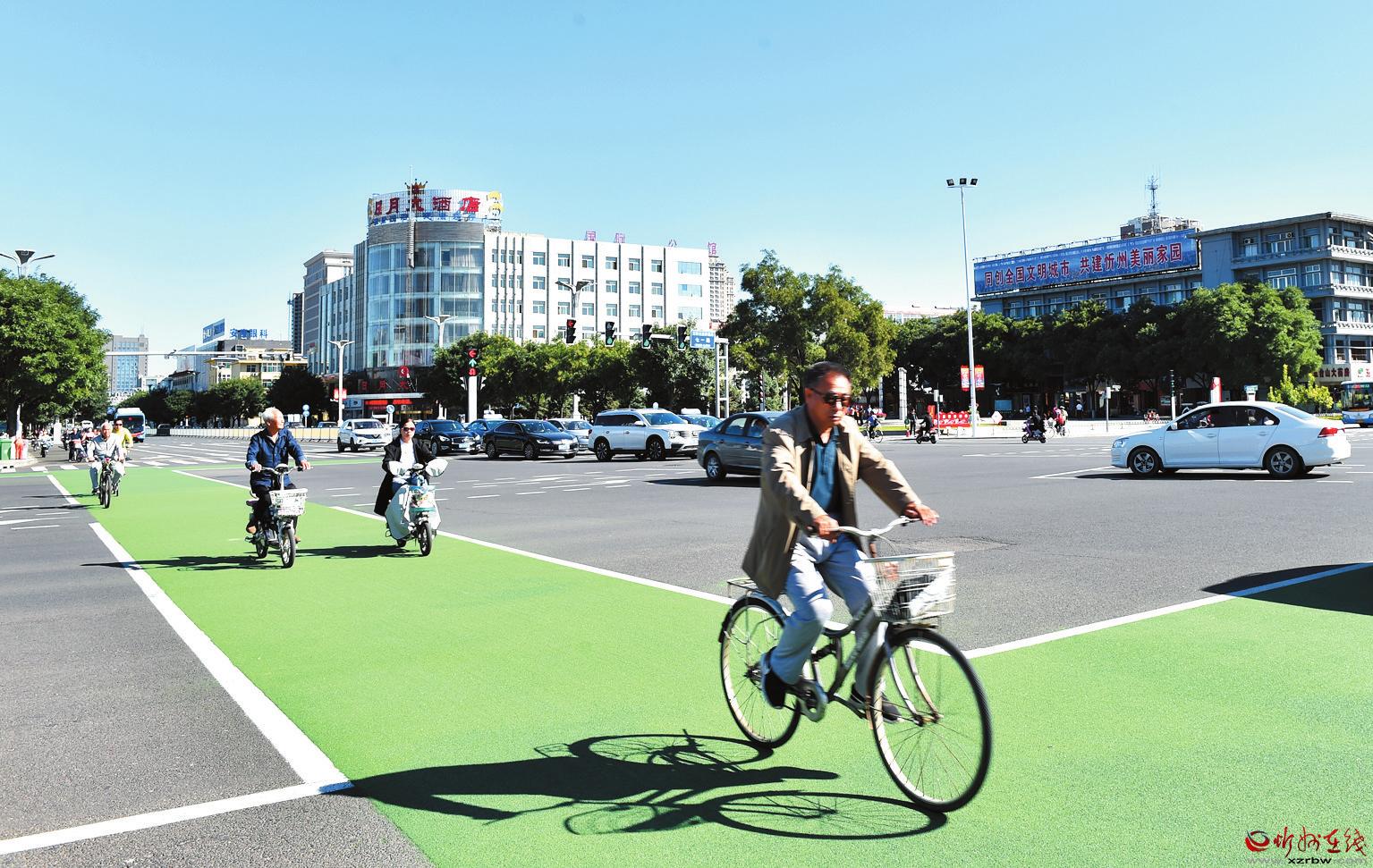 9月3日,市民在忻州城區(qū)七一路與長征街交叉路口的自行車專用道上騎行。日前,忻州路面上出現人車分離“斑馬線”,行人走斑馬線、騎行則走專用自行車道,很好地實現了人和非機動車分流通過,為創(chuàng)建文明城市增色。 宮清華 攝