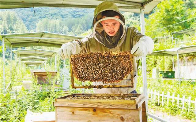 △石柱縣中益鄉(xiāng),蜂農查看蜜蜂生長和產蜜情況。