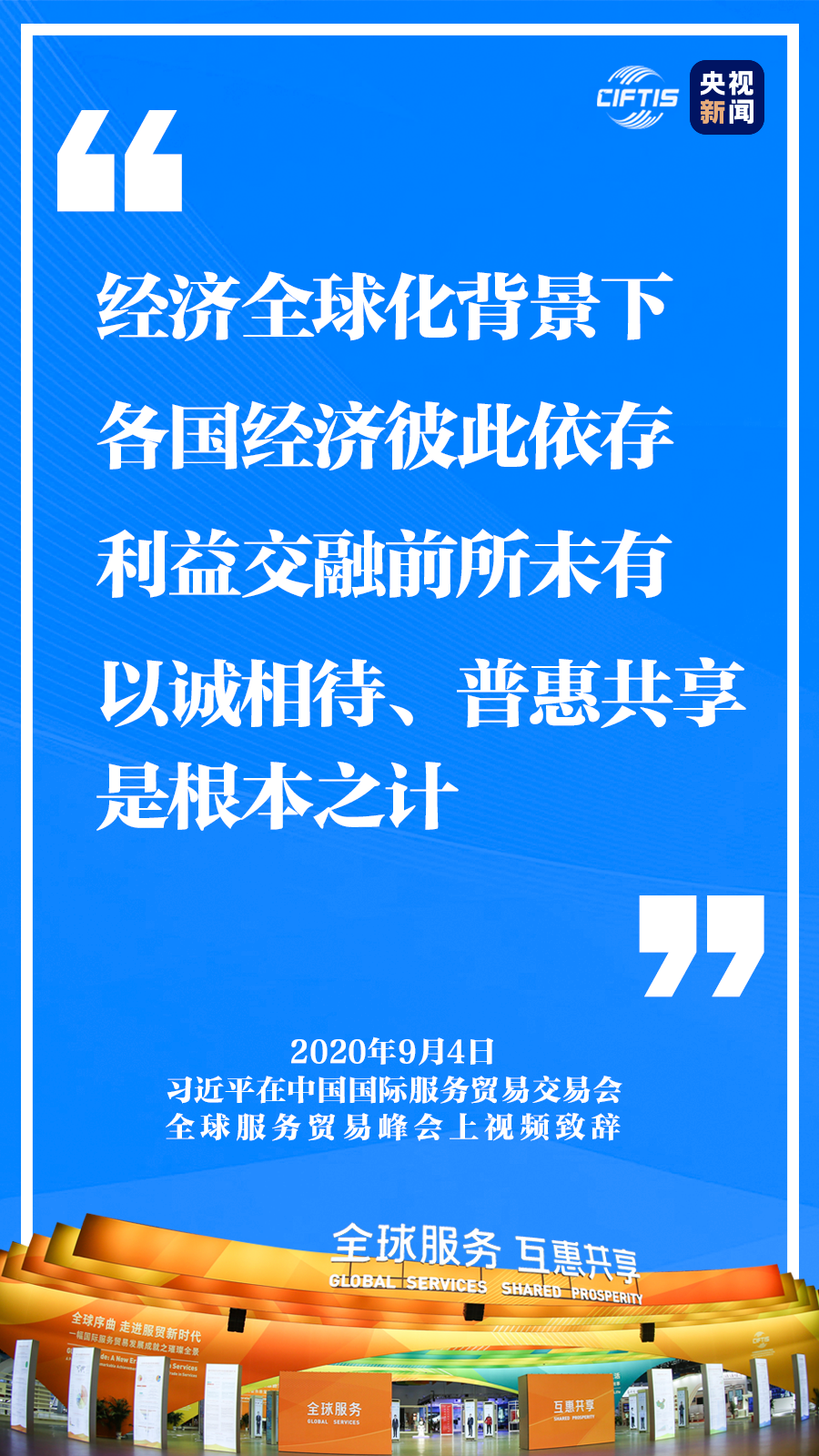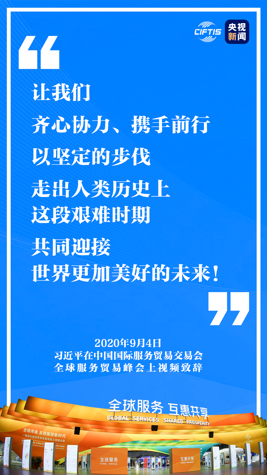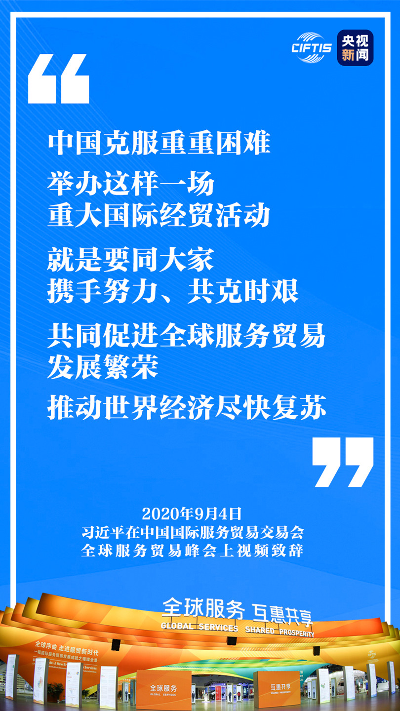 中國克服重重困難,舉辦這樣一場重大國際經(jīng)貿(mào)活動,就是要同大家攜手努力、共克時艱,共同促進(jìn)全球服務(wù)貿(mào)易發(fā)展繁榮,推動世界經(jīng)濟(jì)盡快復(fù)蘇。
