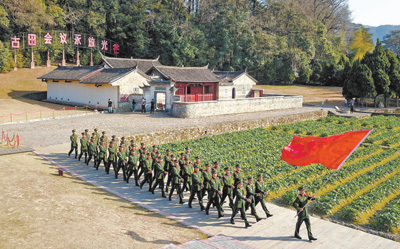 武警福建總隊(duì)龍巖支隊(duì)組織官兵在古田會(huì)議會(huì)址前重溫初心。