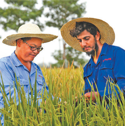 在巴基斯坦東部旁遮普省首府拉合爾西南郊,中國農業(yè)專家(左)與育種站助理研究員瓦西姆·瓦希德在稻田里進行雜交水稻選種試驗。新華社記者 蔣 超攝