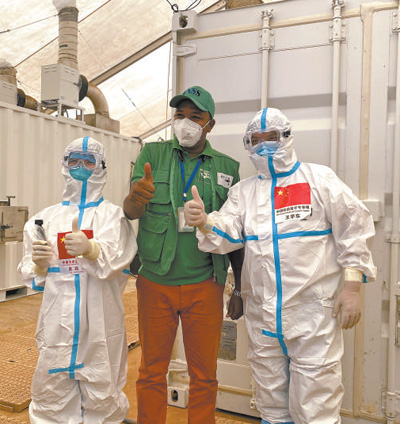 2020年9月2日,在幾內亞首都科納克里的一個核酸檢測取樣點,中國抗疫醫(yī)療專家組成員與當?shù)毓ぷ魅藛T合影。新華社發(fā)