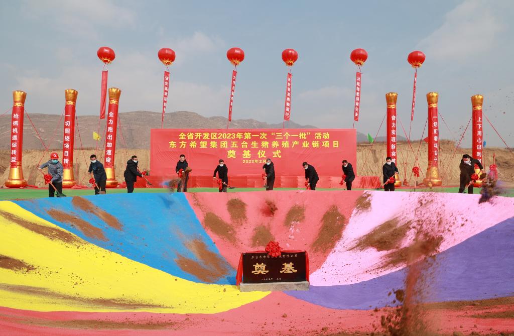 共同為“開工一批”重點(diǎn)項(xiàng)目東方希望集團(tuán)東雷養(yǎng)殖項(xiàng)目培土奠基。張存良 攝