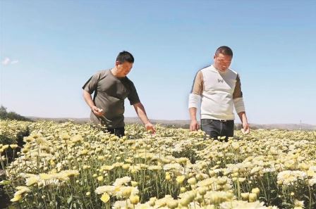 有了方向,行動(dòng)是關(guān)鍵。黨員徐大衛(wèi)主動(dòng)請(qǐng)纓,第一時(shí)間不遠(yuǎn)千里趕赴菊花主產(chǎn)區(qū)射陽考察菊花種植項(xiàng)目,經(jīng)過充分分析研判,篩選適宜五寨種植的品種,最終選定北京菊試種。同時(shí),他帶著誠(chéng)意誠(chéng)心,從射陽請(qǐng)來3名技術(shù)專家。在晉西北中藥材產(chǎn)業(yè)孵化園附近,他與3位專家同吃同住,深入田間地頭,與群眾同勞作、共生活。依據(jù)菊花種植要求,手把手教會(huì)群眾平整土地、開挖溝槽、栽種澆水、鋤草施肥和采挖收儲(chǔ)等中藥材精耕細(xì)作技術(shù)。針對(duì)菊花農(nóng)殘、重金屬超標(biāo)的問題,在試種過程中,他精心研究、反復(fù)摸索,大膽探索出了一套適用于菊花的種植技術(shù),實(shí)現(xiàn)了菊花農(nóng)殘可控的突破,先試種的100畝菊花,獲得了成功。