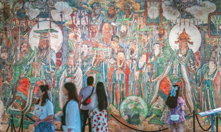 永樂(lè)宮“壁彩重華”展廳內(nèi),在3D打印、數(shù)字壁畫、AR識(shí)別等數(shù)字技術(shù)加持下,700多年前的壁上丹青,完美再現(xiàn)絕世容顏。