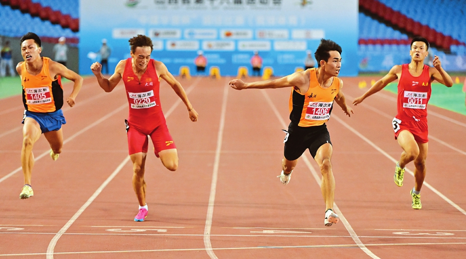 8月16日晚,省第十六屆運(yùn)動(dòng)會(huì)田徑比賽男子甲組百米對(duì)決中,長治市運(yùn)動(dòng)員王隆以10秒62的成績奪得冠軍。本報(bào)記者劉通 本報(bào)通訊員王中勛攝