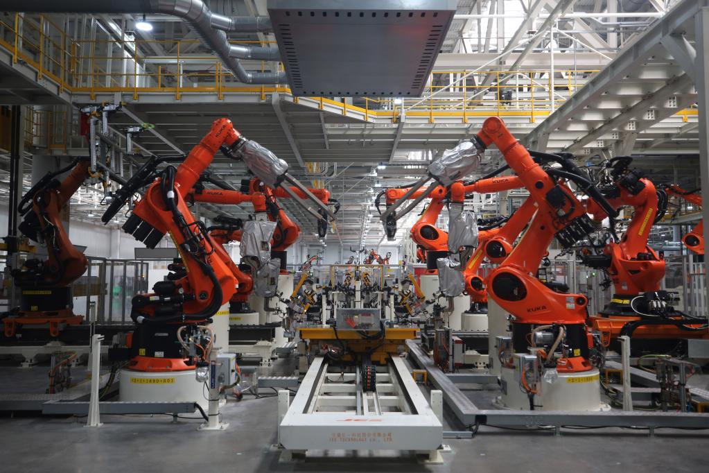 黃色的機(jī)械臂上下?lián)]舞,無(wú)人搬運(yùn)車(chē)穿梭不停,焊裝線火花四濺,配備了高精度傳感器和先進(jìn)機(jī)器視覺(jué)系統(tǒng)的焊接機(jī)器人正在精準(zhǔn)焊接車(chē)身部件……