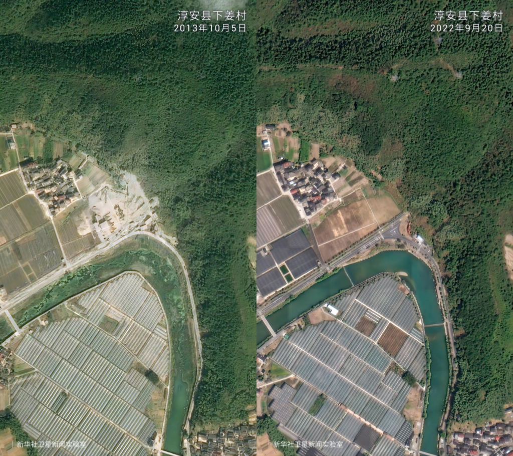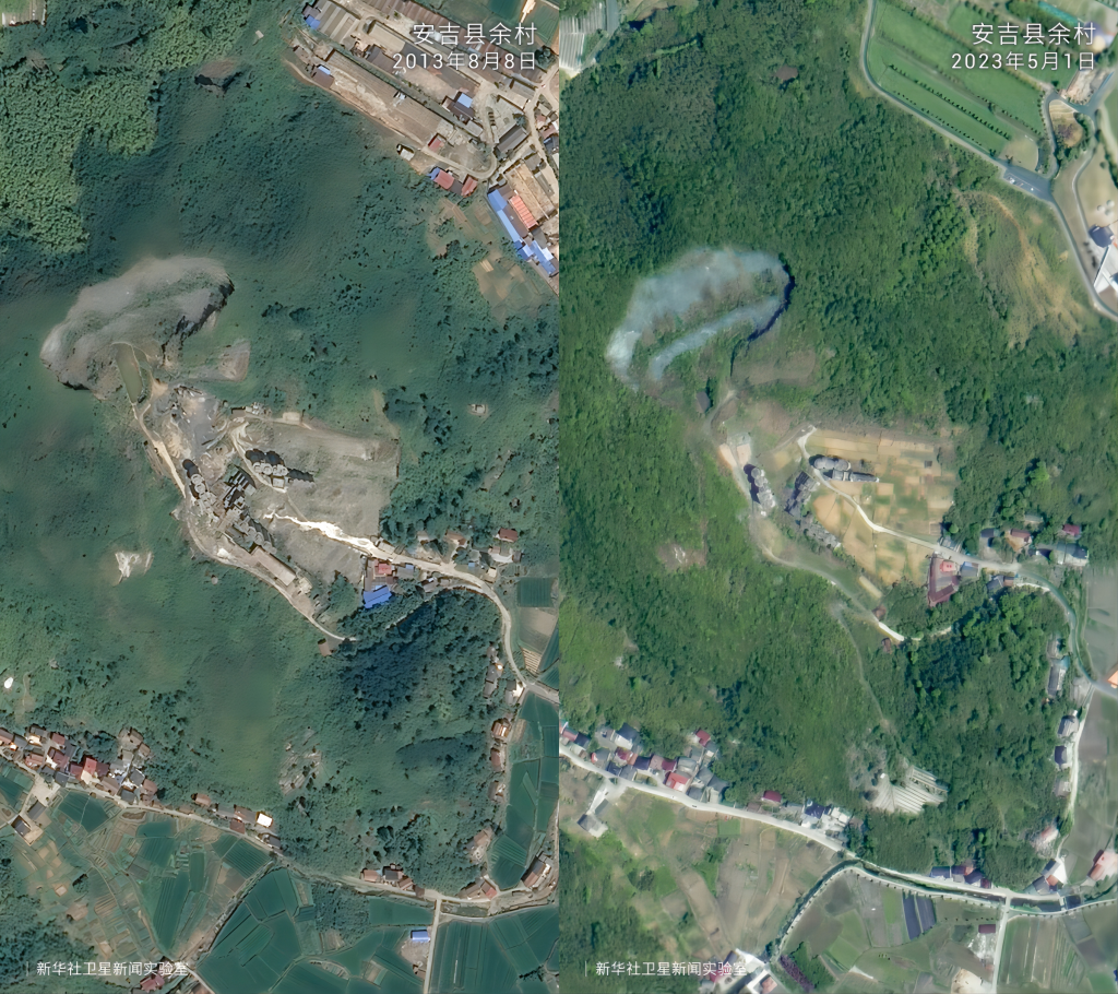 在“綠水青山就是金山銀山”理念指引下,20年來浙江省安吉縣余村完成了從水泥廠、礦山遍布到“人在余村走、就是畫中游”的精彩蝶變。衛(wèi)星云圖中的大片灰色如今已被滿目綠色所覆蓋,從“工業(yè)飛鳥”到“生態(tài)田園”,余村百姓看到了美景,富足了精神。