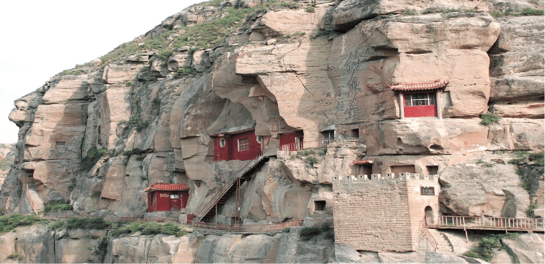 故城石窟位于保德縣楊家灣鎮(zhèn)故城村西1500米、黃河?xùn)|岸石崖上。清順治二年(1645),由陳奇瑜構(gòu)筑,歷時(shí)三年建成,建有呂仙祠等建筑。故城石窟坐東向西,占地面積約600平方米。向南石砌的古堡式門洞,門洞上方匾書“釣魚臺(tái)”,頂部砌有女兒墻垛口。山壁上有大小不等的10孔人工開鑿的石窟。