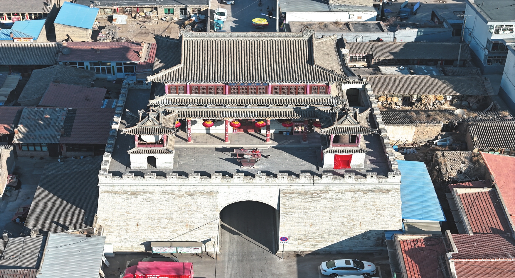 繁峙鼓樓位于該縣繁城鎮(zhèn)東城街村鼓樓巷1號,坐北朝南,總高23.22米,占地面積約796.23平方米。城臺高9.65米、南北長23.79米、東西寬25.24米。馬道南北長22.39米、東西寬3米。城樓南北長9.66米、東西寬14.6米。鐘鼓樓長寬都是3.13米。
