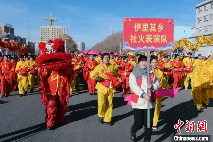 2月12日,農(nóng)歷正月初三,和田市舉行2024年“龍騰盛世·春滿萬(wàn)家”社火活動(dòng),和田市伊里其鄉(xiāng)社火表演隊(duì)巡街。 張亞輝 攝