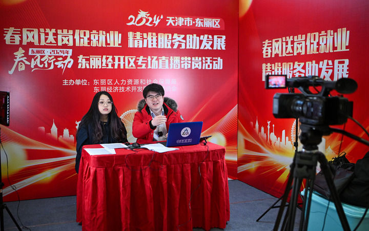 2024年2月29日,主播在天津市東麗區(qū)一場招聘會上進行直播帶崗。新華社記者 孫凡越 攝