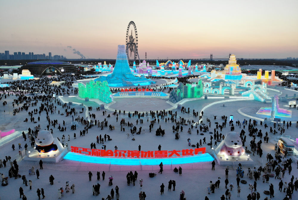 2024年2月15日,游客在哈爾濱冰雪大世界園區(qū)內(nèi)游玩(無人機(jī)照片)。新華社記者 王建威 攝