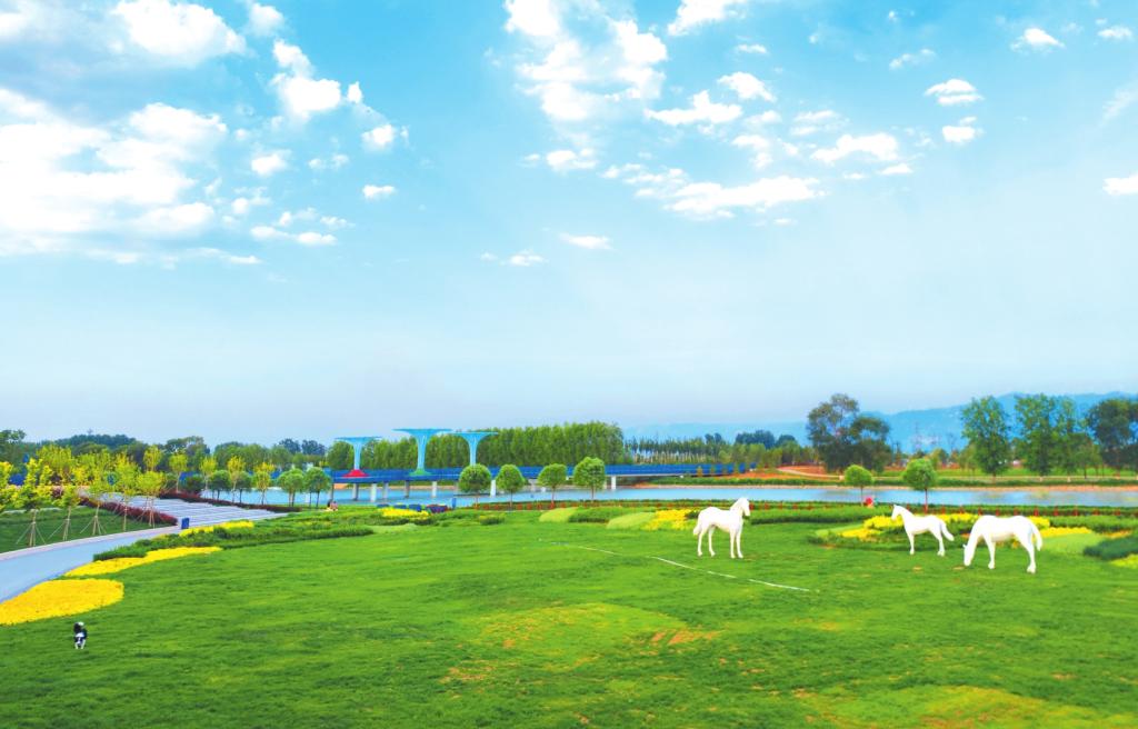 當晨光漫過系舟山脈,為牧馬河鍍上淡金色外衣——這座承載著“太忻綠肺”使命的生態(tài)公園一望無際的蔥蘢畫卷正徐徐展開。遺山橋南側,槐蔭路與丁香路如兩條綢帶伴河而行,晨練者的腳步驚起草葉間閃爍的露珠,恰似散落的翡翠珍珠。4.6公里生態(tài)廊道中,“牧馬十八景”次第蘇醒。從遺山橋以南412米延伸至108國道牧馬河橋,狹長濕地如綠色動脈連接城鄉(xiāng)。在景賢廣場觀景臺遠眺,碧草、白馬、流水與系舟山脈構成水墨長卷。黃昏時分,光絲為弦、流水作琴,天地合奏令人心曠神怡。這里不僅承載著“韌性鄉(xiāng)野植物種子庫”的生態(tài)功能,更通過10座配備AED急救箱、微波爐的智慧驛站,兌現(xiàn)著“人民公園”的溫暖承諾。