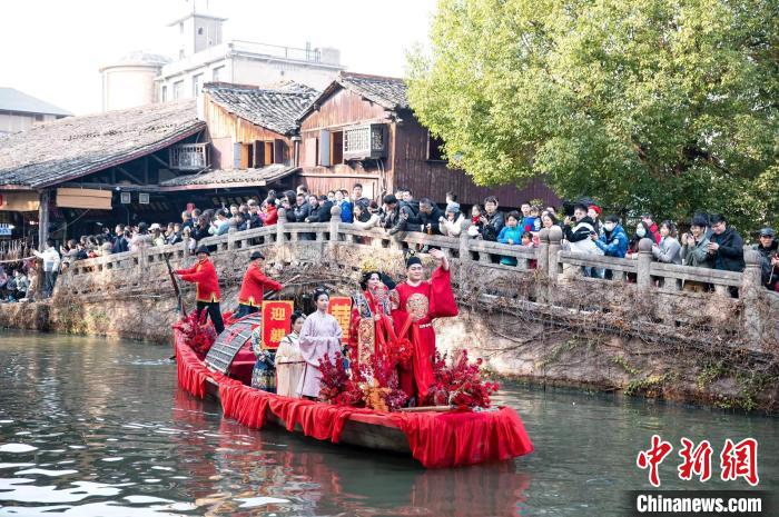 在浙江紹興安昌古鎮(zhèn),記者到訪時(shí),在碧水之上,一場明制婚禮正在舉行,再現(xiàn)了烏篷船接親的當(dāng)?shù)鼗樗?。從單純表演到定制化服?wù),今年“五一”假期就有新人預(yù)訂了自己的水上婚禮。