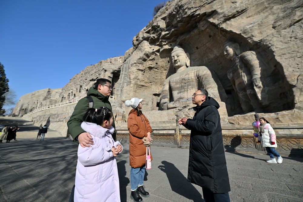 云岡研究院院長(zhǎng)杭侃(左)在給游客講解石窟的歷史知識(shí)(2024年2月25日攝)。