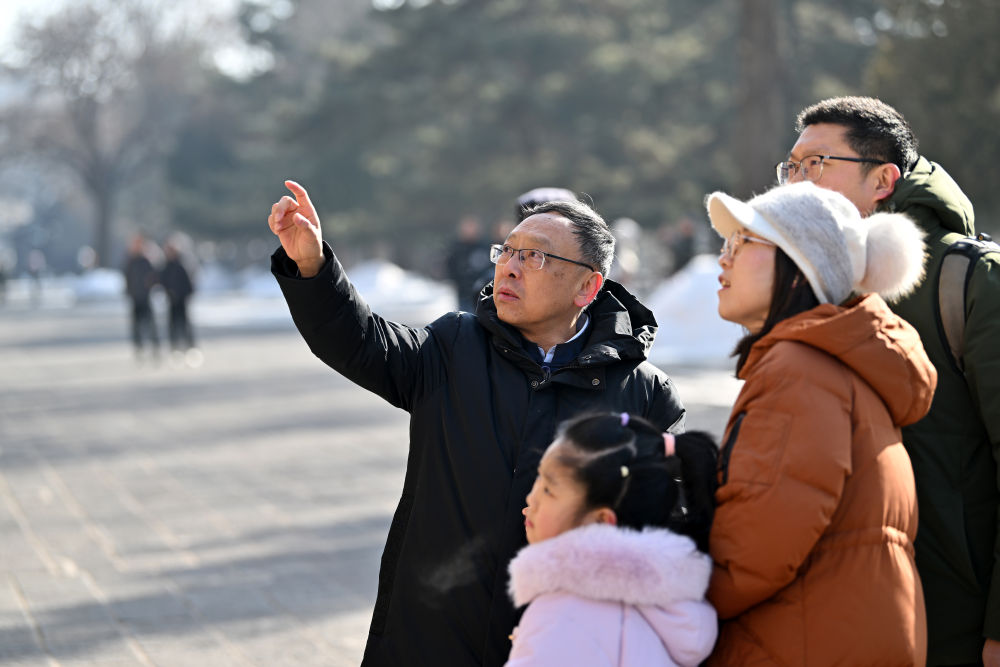 在山西大同云岡石窟,云岡研究院院長(zhǎng)杭侃(右)在給游客講解石窟的歷史知識(shí)(2024年2月25日攝)。