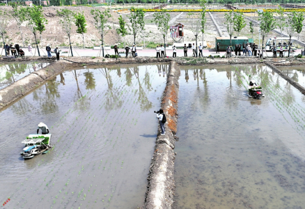 5月28日,太原市晉源區(qū)晉祠水稻插秧節(jié)在稻田公園舉行。活動現場,機器轟鳴、水波蕩漾,自動化插秧機勻速前進,水田里留下一簇簇新綠。卷褲腳、戴草帽、踏稻田、插秧苗、踩泥巴、捉魚蝦……一群群研學的孩子分批下田,感受手工插秧的樂趣,細嗅農耕勞作的氣息。田埂上圍觀群眾的加油聲、喝彩聲不絕于耳,現場一片熱火朝天。