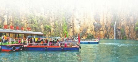 伴隨著他的講解,穿過800米的“時(shí)空隧道”,八泉峽山清水秀的核心地帶就躍然眼前了。3000米長(zhǎng)的游船觀光水路時(shí)寬時(shí)窄,順流而下,游船上靜聽水流鳥鳴,看水中游魚穿梭而過,高峽平湖間,隨手一拍即是如畫美景,或碧波蕩漾,或山崖高聳,平靜的湖面與對(duì)峙的高山形成鮮明對(duì)比,不負(fù)“抬頭張家界,低頭九寨溝”之美名。