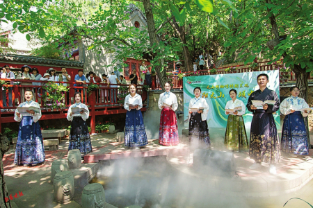 在太山景區(qū)售票廳里,背誦古詩詞免門票的活動(dòng)吸引了不少18周歲以下的學(xué)生參加,大家通過轉(zhuǎn)盤選定需要背誦的古詩詞,完成背誦即可獲得門票一張?!昂屯瑢W(xué)們正好一塊兒來了,通過參加這個(gè)活動(dòng),弘揚(yáng)我們的傳統(tǒng)文化,是非常有意義的?!苯衲晔钇冢骄皡^(qū)面向廣大學(xué)生推出皮影戲、手工DIY印章、拓印等非遺體驗(yàn)活動(dòng)。同時(shí),景區(qū)還準(zhǔn)備了2000多套漢服,免費(fèi)為游客提供。