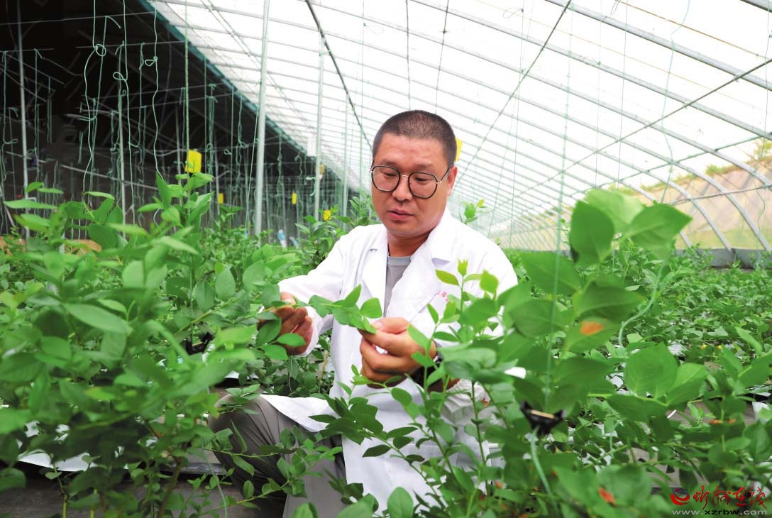 智慧大棚負責(zé)人馮祥君察看藍莓生長情況。