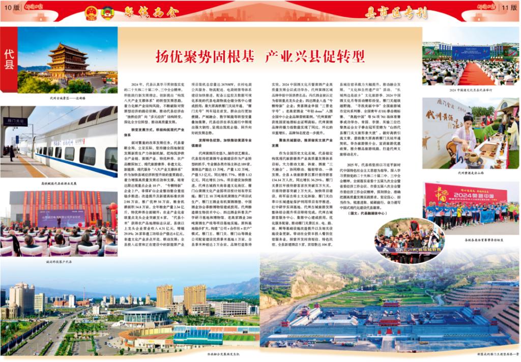 2024年,代縣認真學習貫徹落實黨的二十大和二十屆二中、三中全會精神,積極踐行新發(fā)展理念,創(chuàng)新提出“構筑八大產(chǎn)業(yè)支撐體系”的轉型發(fā)展思路,著力化解產(chǎn)業(yè)結構風險,不斷破除對資源型經(jīng)濟的路徑依賴,推動代縣經(jīng)濟由“獨鐵經(jīng)濟”向“多元經(jīng)濟”結構轉變,深化全方位轉型、推動高質(zhì)量發(fā)展。