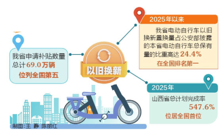 2025年以來,我省電動自行車以舊換新置換量占公安部披露的本省電動自行車總保有量的比重高達24.4%,在全國排名第一。以2025年全國建議工作量計算,山西省的總計劃完成率達到547.6%,位居全國首位。