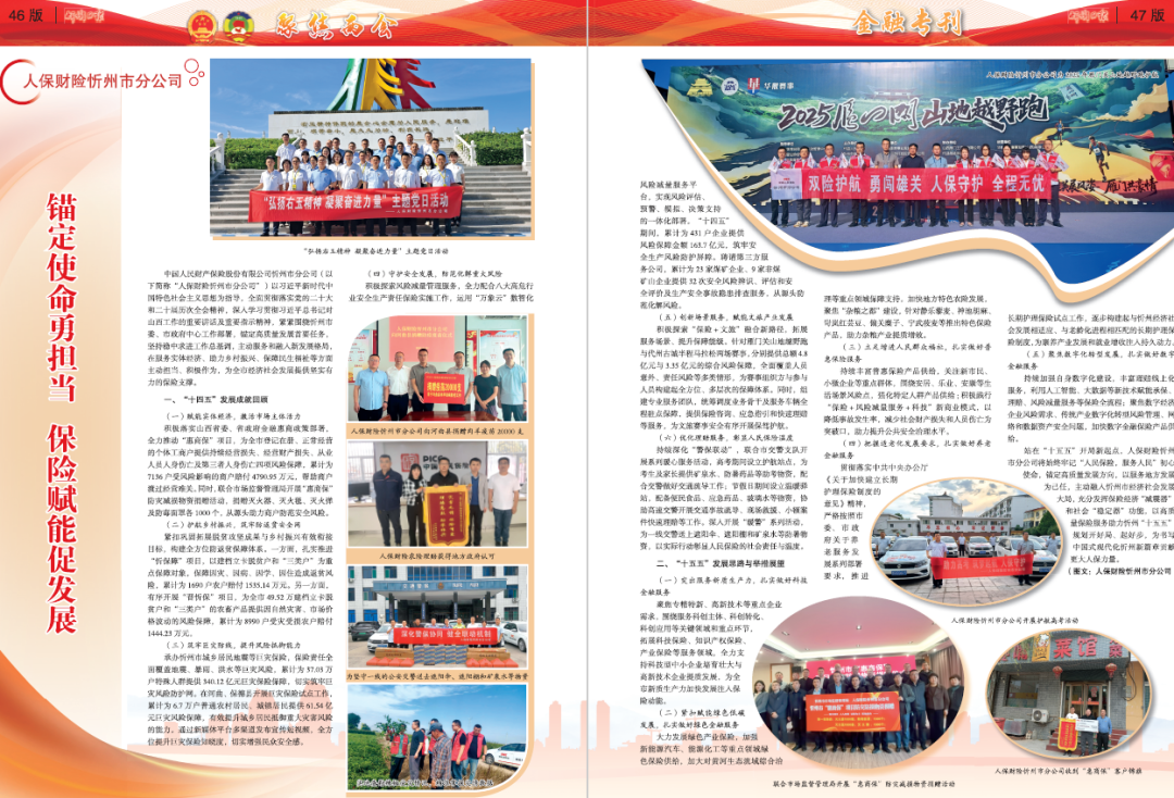 錨定使命勇?lián)?/strong> 保險賦能促發(fā)展 中國人民財產(chǎn)保險股份有限公司忻州市分公司(以下簡稱“人保財險忻州市分公司”)以習(xí)近平新時代中國特色社會主義思想為指導(dǎo),全面貫徹落實黨的二十大和二十屆歷次全會精神,深入學(xué)習(xí)貫徹習(xí)近平總書記對山西工作的重要講話及重要指示精神,緊緊圍繞忻州市委、市政府中心工作部署,錨定高質(zhì)量發(fā)展首要任務(wù),堅持穩(wěn)中求進工作總基調(diào),主動服務(wù)和融入新發(fā)展格局,在服務(wù)實體經(jīng)濟、助力鄉(xiāng)村振興、保障民生福祉等方面主動擔(dān)當、積極作為,為全市經(jīng)濟社會發(fā)展提供堅實有力的保險支撐。 一、“十四五”發(fā)展成就回顧 (一)賦能實體經(jīng)濟,激活市場主體活力 積極落實山西省委、省政府金融惠商政策部署,全力推動“惠商?!表椖?,為全市登記在冊、正常經(jīng)營的個體工商戶提供持續(xù)經(jīng)營損失、經(jīng)營財產(chǎn)損失、從業(yè)人員人身傷亡及第三者人身傷亡四項風(fēng)險保障,累計為7136戶受風(fēng)險影響的商戶賠付4790.95萬元,幫助商戶渡過經(jīng)營難關(guān)。同時,聯(lián)合市場監(jiān)督管理局開展“惠商?!狈罏?zāi)減損物資捐贈活動,捐贈滅火器、滅火毯、滅火彈及防毒面罩各1000個,從源頭助力商戶防范安全風(fēng)險。 (二)護航鄉(xiāng)村振興,筑牢防返貧安全網(wǎng) 緊扣鞏固拓展脫貧攻堅成果與鄉(xiāng)村振興有效銜接目標,構(gòu)建全方位防返貧保障體系。一方面,扎實推進“忻保障”項目,以建檔立卡脫貧戶和“三類戶”為重點保障對象,保障因災(zāi)、因病、因?qū)W、因住造成返貧風(fēng)險,累計為1690戶農(nóng)戶賠付1535.14萬元。另一方面,有序開展“晉忻?!表椖?,為全市49.52萬建檔立卡脫貧戶和“三類戶”的農(nóng)畜產(chǎn)品提供因自然災(zāi)害、市場價格波動的風(fēng)險保障,累計為8990戶受災(zāi)受損農(nóng)戶賠付1444.23萬元。 (三)筑牢巨災(zāi)防線,提升風(fēng)險抵御能力 承辦忻州市城鄉(xiāng)居民地震等巨災(zāi)保險,保險責(zé)任全面覆蓋地震、暴雨、洪水等巨災(zāi)風(fēng)險,累計為37.03萬戶特殊人群提供340.12億元巨災(zāi)保險保障,切實筑牢巨災(zāi)風(fēng)險防護網(wǎng)。在河曲、保德縣開展巨災(zāi)保險試點工作,累計為6.7萬戶普通農(nóng)村居民、城鎮(zhèn)居民提供61.54億元巨災(zāi)風(fēng)險保障,有效提升城鄉(xiāng)居民抵御重大災(zāi)害風(fēng)險的能力。通過新媒體平臺多渠道發(fā)布宣傳短視頻,全方位提升巨災(zāi)保險知曉度,切實增強民眾安全感。 (四)守護安全發(fā)展,防范化解重大風(fēng)險 積極探索風(fēng)險減量管理服務(wù),全力配合八大高危行業(yè)安全生產(chǎn)責(zé)任保險實施工作,運用“萬象云”數(shù)智化風(fēng)險減量服務(wù)平臺,實現(xiàn)風(fēng)險評估、預(yù)警、模擬、決策支持的一體化部署?!笆奈濉逼陂g,累計為431戶企業(yè)提供風(fēng)險保障金額163.7億元,筑牢安全生產(chǎn)風(fēng)險防護屏障。聘請第三方服務(wù)公司,累計為23家煤礦企業(yè)、9家非煤礦山企業(yè)提供32次安全風(fēng)險辨識、評估和安全評價及生產(chǎn)安全事故隱患排查服務(wù),從源頭防范化解風(fēng)險。 (五)創(chuàng)新場景服務(wù),賦能文旅產(chǎn)業(yè)發(fā)展 積極探索“保險+文旅”融合新路徑,拓展服務(wù)場景、提升保障能級。針對雁門關(guān)山地越野跑與代州古城半程馬拉松兩場賽事,分別提供總額4.8億元與3.35億元的綜合風(fēng)險保障,全面覆蓋人員意外、責(zé)任風(fēng)險等多類情形,為賽事組織方與參與人員構(gòu)建起全方位、多層次的保障體系。同時,組建專業(yè)服務(wù)團隊,統(tǒng)籌調(diào)度業(yè)務(wù)骨干及服務(wù)車輛全程駐點保障,提供保險咨詢、應(yīng)急指引和快速理賠等服務(wù),為文旅賽事安全有序開展保駕護航。 (六)優(yōu)化理賠服務(wù),彰顯人民保險溫度 持續(xù)深化“警保聯(lián)動”,聯(lián)合市交警支隊開展系列暖心服務(wù)活動,高考期間設(shè)立護航站點,為考生及家長提供礦泉水、防暑藥品等助考物資,配合交警做好交通疏導(dǎo)工作;節(jié)假日期間設(shè)立溫暖驛站,配備便民食品、應(yīng)急藥品、玻璃水等物資,協(xié)助高速交警開展交通事故疏導(dǎo)、現(xiàn)場救援、小額案件快速理賠等工作。深入開展“暖警”系列活動,為一線交警送上遮陽傘、遮陽棚和礦泉水等防暑物資,以實際行動彰顯人民保險的社會責(zé)任與溫度。 二、“十五五”發(fā)展思路與舉措展望 (一)突出服務(wù)新質(zhì)生產(chǎn)力,扎實做好科技金融服務(wù) 聚焦專精特新、高新技術(shù)等重點企業(yè)需求,圍繞服務(wù)科創(chuàng)主體、科創(chuàng)轉(zhuǎn)化、科創(chuàng)應(yīng)用等關(guān)鍵領(lǐng)域和重點環(huán)節(jié),拓展科技保險、知識產(chǎn)權(quán)保險、產(chǎn)業(yè)保險等服務(wù)領(lǐng)域,全力支持科技型中小企業(yè)培育壯大與高新技術(shù)企業(yè)提質(zhì)發(fā)展,為全市新質(zhì)生產(chǎn)力加快發(fā)展注入保險動能。 (二)緊扣賦能綠色低碳發(fā)展,扎實做好綠色金融服務(wù) 大力發(fā)展綠色產(chǎn)業(yè)保險,加強新能源汽車、能源化工等重點領(lǐng)域綠色保險供給,加
